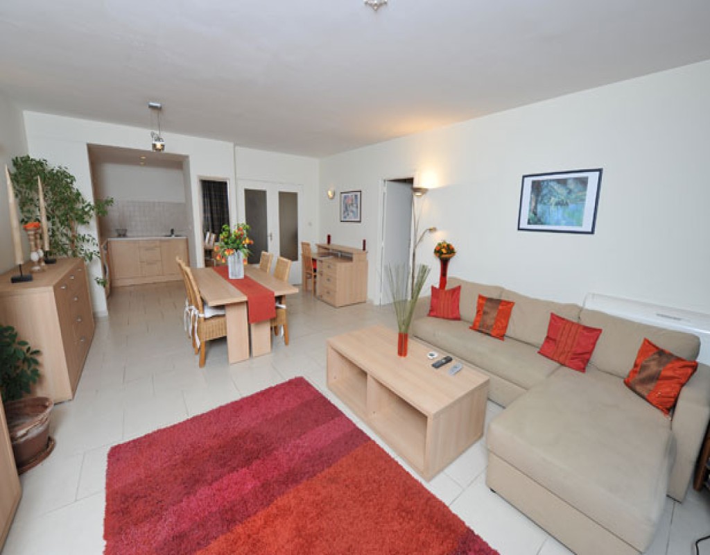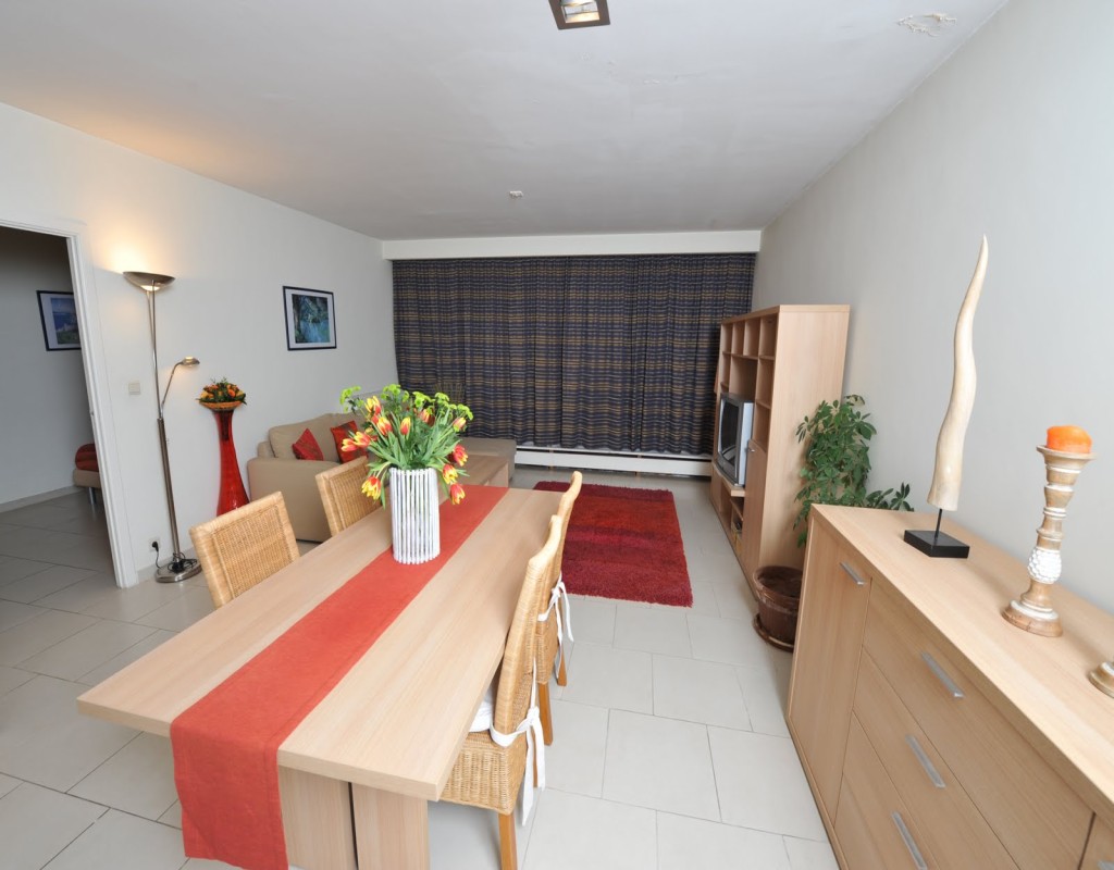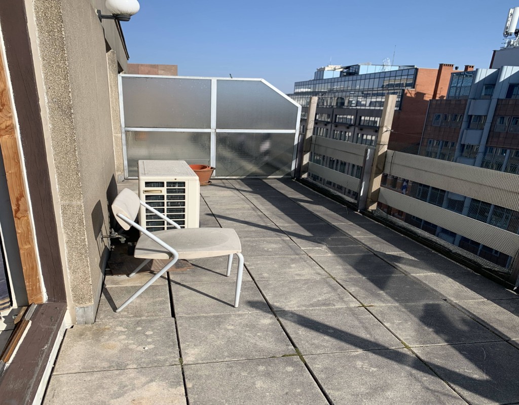 In the heart of the EU district, large furnished one-bedroom apartment on the 7th floor of a 1970s building. It comprises: hall with separate toilet, living room with fitted kitchen, separate bedroom, bathroom, and large outdoor terrace. PEB F. Info and viewings: Alessandro Meschi 0496 20 22 63.