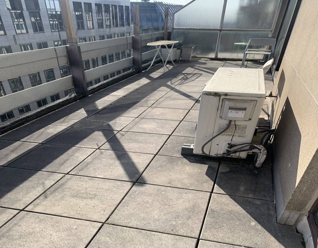 In the heart of the EU district, large furnished one-bedroom apartment on the 7th floor of a 1970s building. It comprises: hall with separate toilet, living room with fitted kitchen, separate bedroom, bathroom, and large outdoor terrace. PEB F. Info and viewings: Alessandro Meschi 0496 20 22 63.
